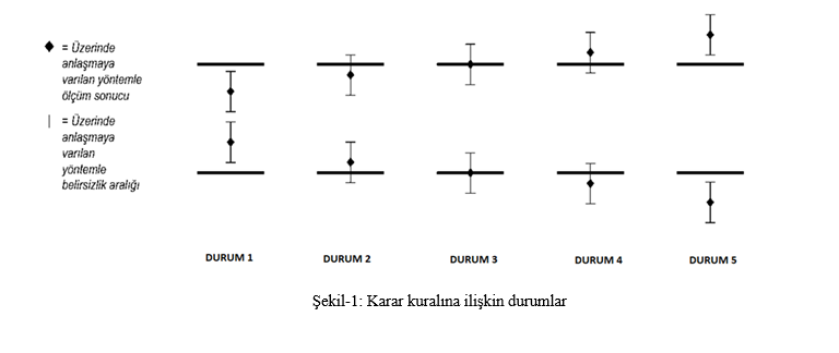 Ancak 2,3 ve 4 numaralı durumlarda, uygunluğun değerlendirilmesi çok net değildir, çünkü belirsizlik aralığı limit değeriyle kesişmektedir. Uygunluk bildiriminin nasıl yapılacağı, yasal otoriteler veya düzenleyici kuruluşlar ve zorunlu mevzuatlarda tanımlanmamış ise müşterinin talepleri doğrultusunda uygunluk veya uygunsuzluk durumlarının belirlenmesi için karar kuralı oluşturulmuştur.